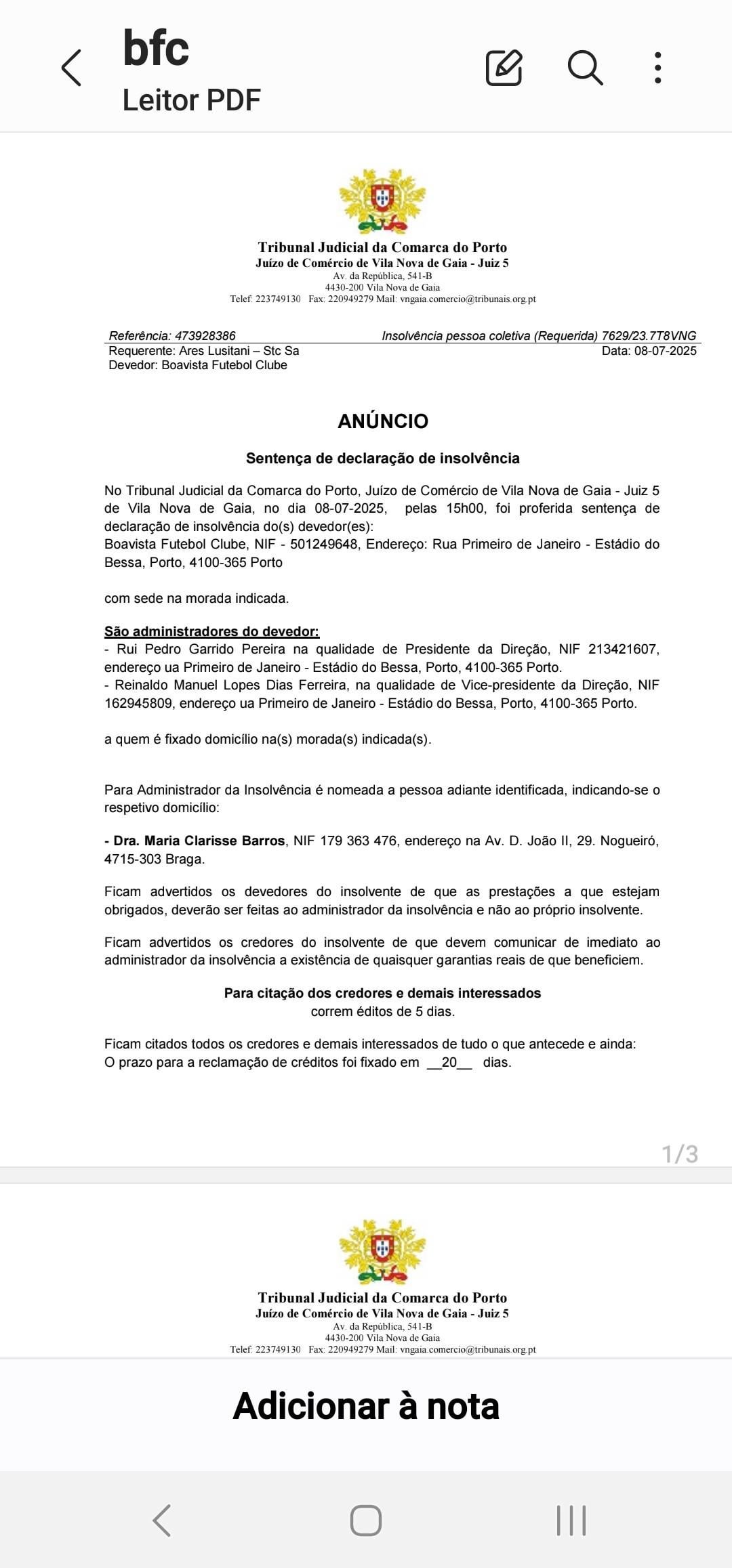 Ora, pelas 15 horas desta terça-feira, o Tribunal Judicial da Comarca do Porto – através do Tribunal do Comércio de Vila Nova de Gaia – proferiu sentença de declaração de insolvência. Mas, horas antes, os terrenos do Estádio do Bessa foram leiloados por 5,55 milhões de euros.”