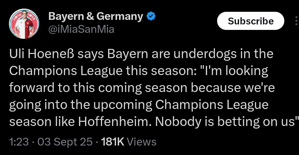 Surely I can't be the only one who finds this statement embarrassing. What happened to our ambitions, being top and absolute favourites going into every competition. Now, he's trying to tell me "We are underdogs" nothing wrong being an underdog but for a club like Bayern, they should always be the absolute favourites.