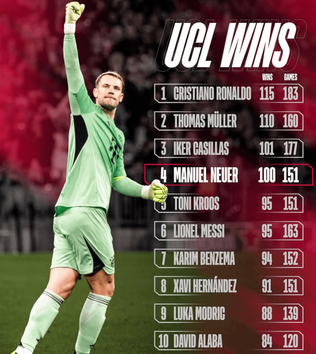 Share Facebook Twitter LinkedIn Pinterest Bluesky Threads After last nights win against Chelsea, Neuer Recorded his 100 Wins in UCL in 4th place by Slow_Week_6189 FC Bayern Munich football fußball Germany Soccer