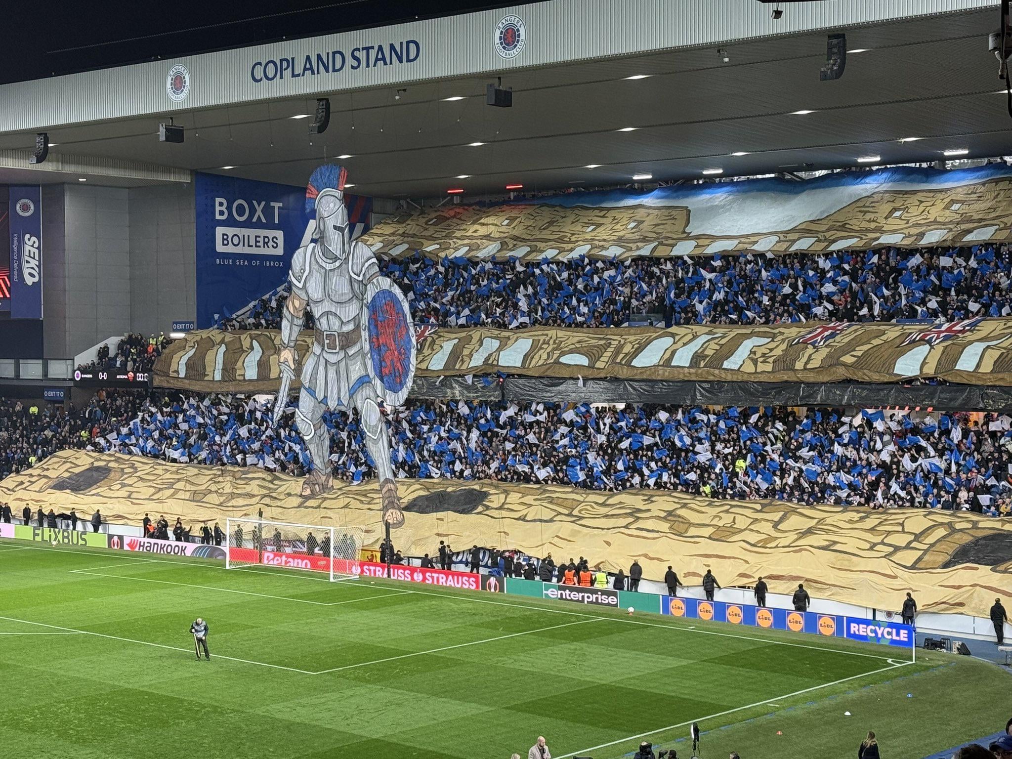Share Facebook Twitter LinkedIn Pinterest Bluesky Threads Gladiator-inspired tifo at Ibrox before the game v Roma by Left-Painter-9172 Rangers rangers football club scotland