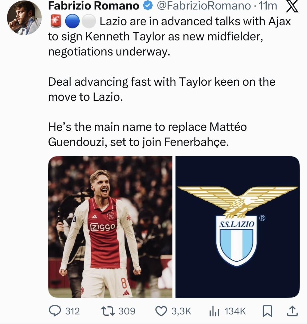 [Fabrizio Romano] Lazio are in advanced talks with Ajax to sign Kenneth Taylor as new midfielder, negotiations underway. Deal advancing fast with Taylor keen on the move to Lazio. He’s the main name to replace Mattéo Guendouzi, set to join Fenerbahçe.