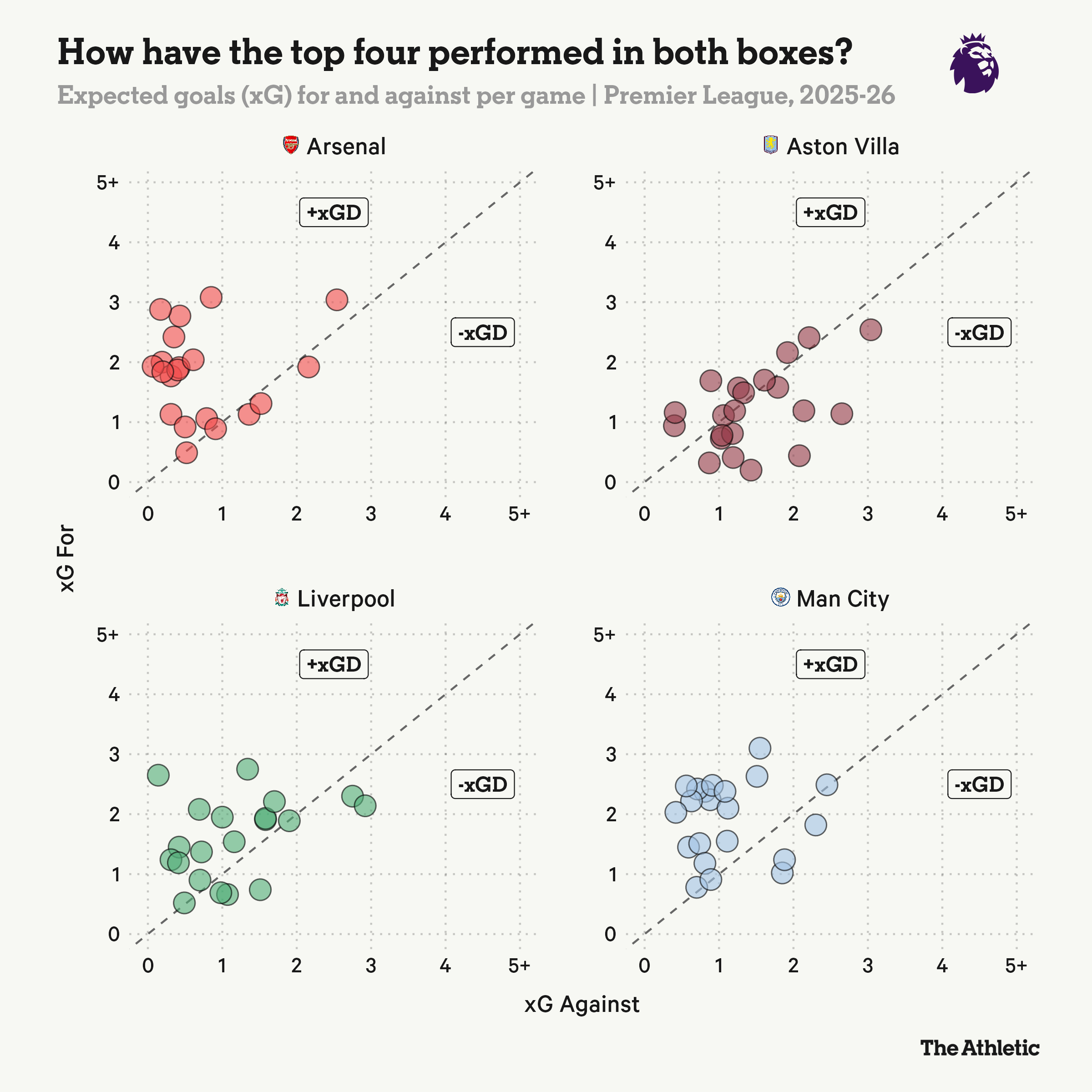 The graphic below maps each game’s xG for and against among those clubs in the top four. Put simply, circles above the dotted line show matches where the team has created higher-quality chances than their opponents, giving them a greater likelihood of victory — and vice versa below the dotted line.
