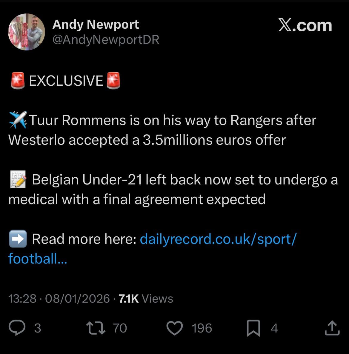[Andy Newport] Tuur Rommens is on his way to Rangers after Westerlo accepted a 3.5millions euros offer by BubbleBlacKa Rangers rangers football club scotland