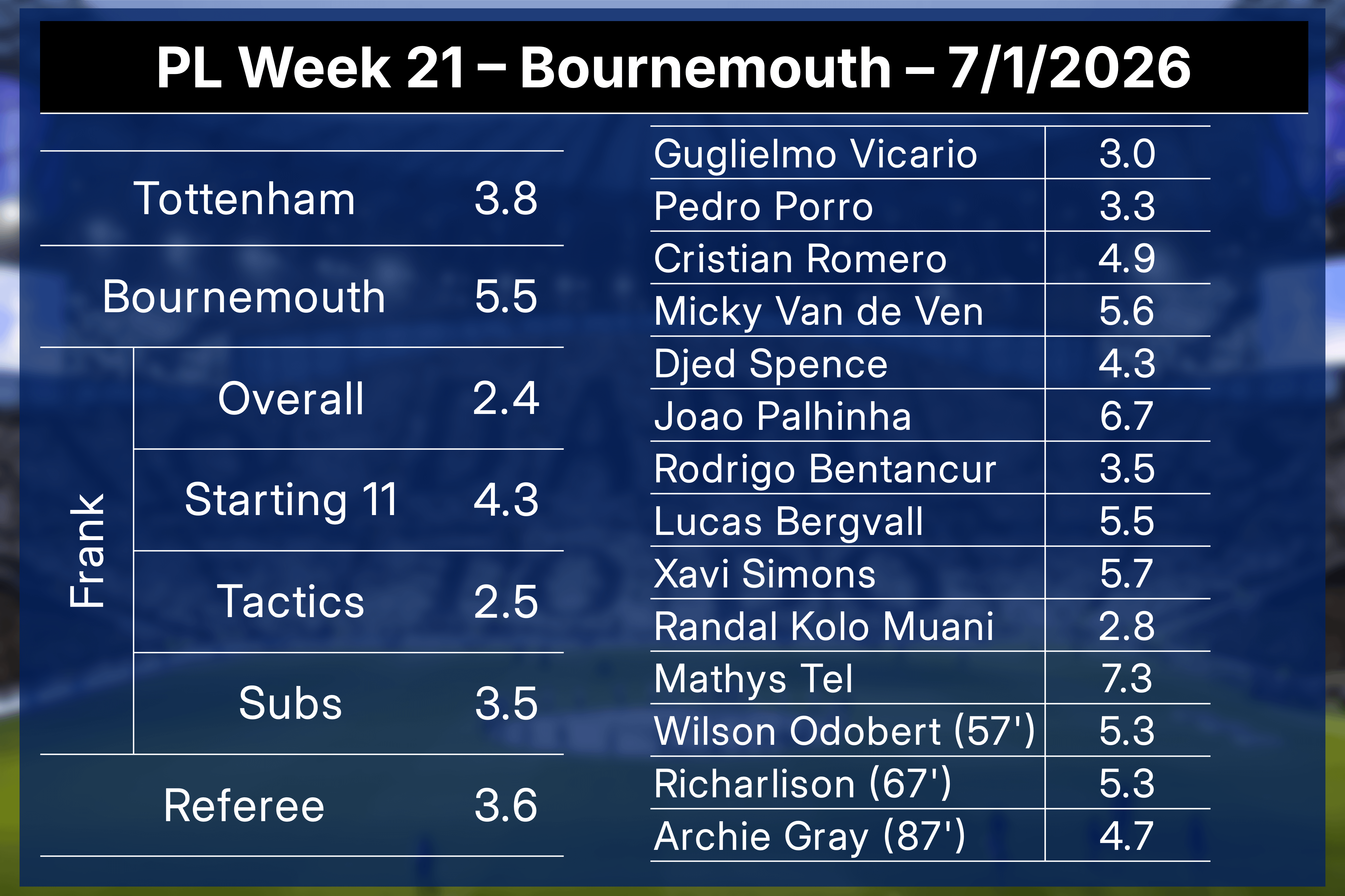 Churada on January 8, 2026 1:14 pm Xavi/Tel/VdV were Spurs best players I felt. Really feel Tel is starting to come good and should start far more often.