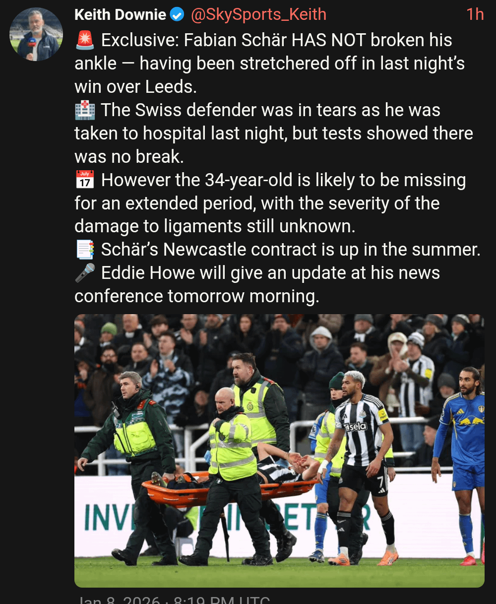 Shot_Occasion4294 on January 8, 2026 9:33 pm It’s not great news, but my god is it a damn sight better than it could have been. Rest up our sweet Swiss prince. Hopefully a contract extension will be waiting for you upon your return