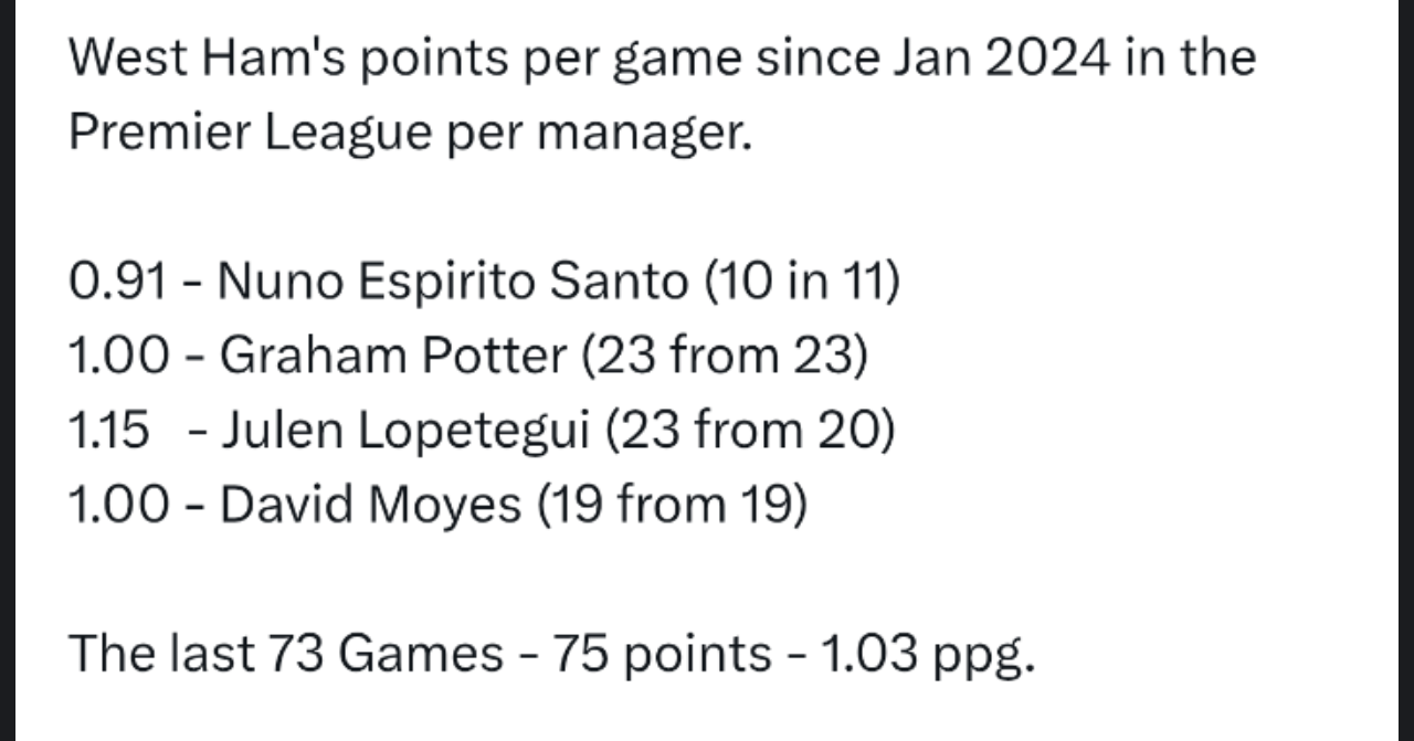 Share Facebook Twitter LinkedIn Pinterest Bluesky Threads Saw this elsewhere. We would need 1.53 points per game to get to 40. Forget great escape, that would be mission impossible. by King_Of_Anglia_ West Ham United West Ham United Football Club