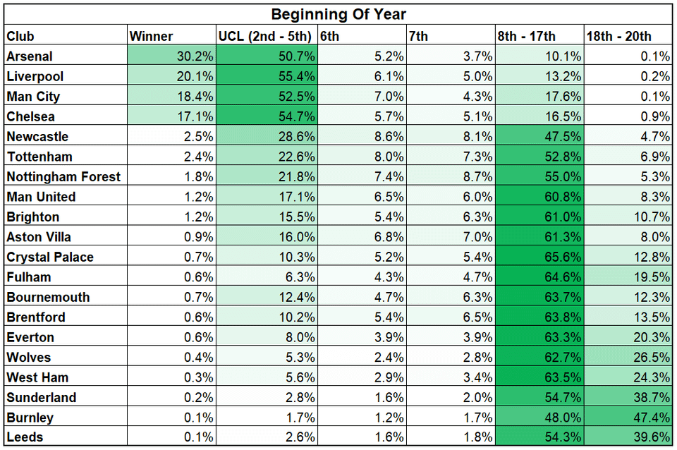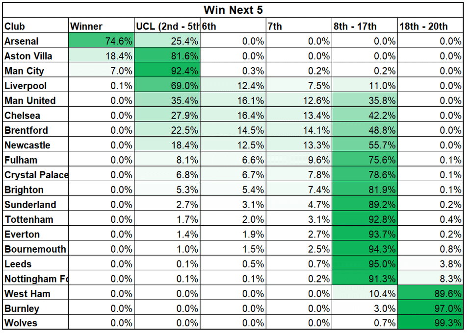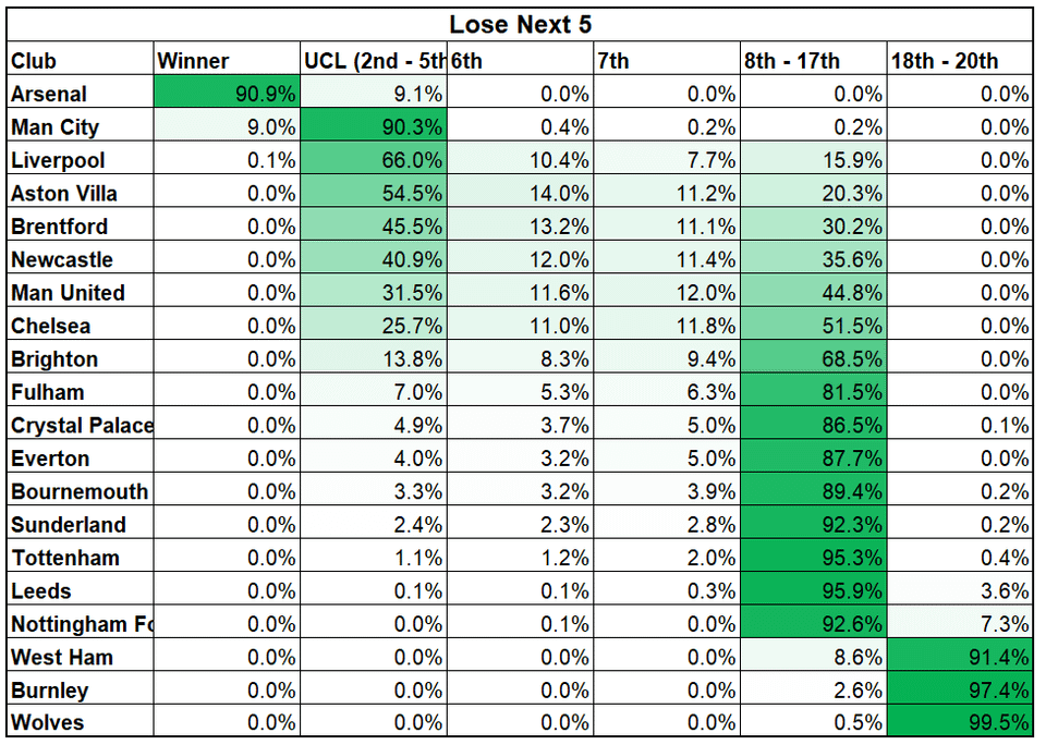 Hi All. Towards the end of last year, when every match seemed to sway the odds of Champions/Europa/Conference League quite a bit, I built a model for myself to understand how different matches might impact our odds. It's an amateur model for sure (I'm not a professional bettor or anything), but it's accurate enough that I enjoyed playing with it. For those who read my posts last year, I intended to make a website over the off-season that anybody can come in and make different results for any matches to see how it impacted their team's odds, although admittedly I never got around to that. Still, I saw some discussion today about whether Kamara being out for a long time would be "catastrophic", so I fired it up and updated it for the current season to try to quantify it. Again, I am not a pro, so it's only directionally accurate. That being said, if you went to the extreme and said that we will win the next 5 EPL matches if we have Kamara, but lose the next 5 without him, this is what I got (also, just regardless of Kamara, I think it's interesting to think about how the odds can change over a 5 game stretch).