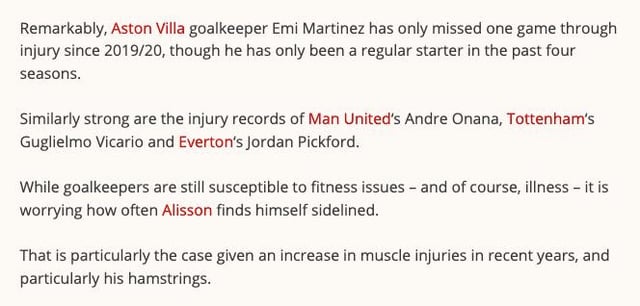 Emi Martinez's injuries may be irritating at the times that they happen. However, if you compare his record to those of other PL keepers since he started playing full-time you'll see he's been much more fit than the rest have. Of course, a bulk of his injuries have occurred more recently. He has missed or subbed off in at least 8 games due to injury since the above stats were released. But he also played through pain numerous times while Alisson and Vicario have each missed almost 3x as many games as Martinez has since the 2024-25 season. Nick Pope has missed almost 2x as much as Martinez has since then. It's also worth mentioning that non-PL keepers Courtois, Neuer and Ter Stegen have missed almost a full year due to an ACL tear or a leg fracture in recent years. Martinez is at an age where injury proneness is more likely but he's maintained his fitness better than other keepers at or around his age have so he deserves the benefit of the doubt for missing games for such reasons.