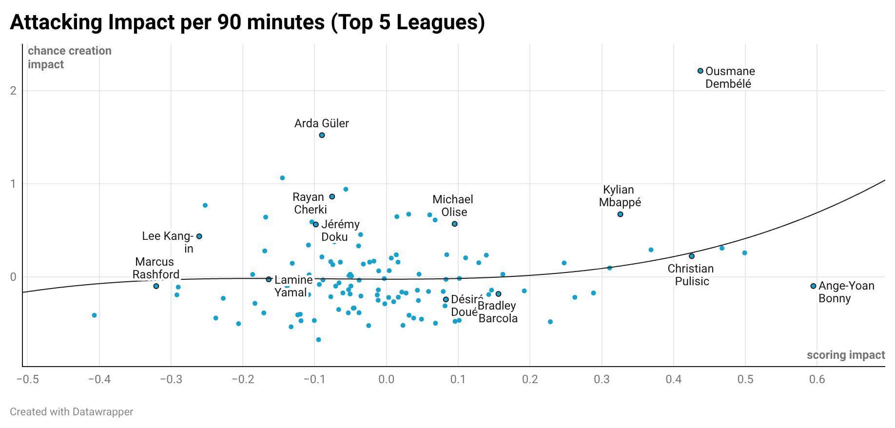 Share Facebook Twitter LinkedIn Pinterest Bluesky Threads Attacking Impact per 90 minutes (Top 5 Leagues) by New_Statement9990 football France Paris Saint-Germain PSG Soccer