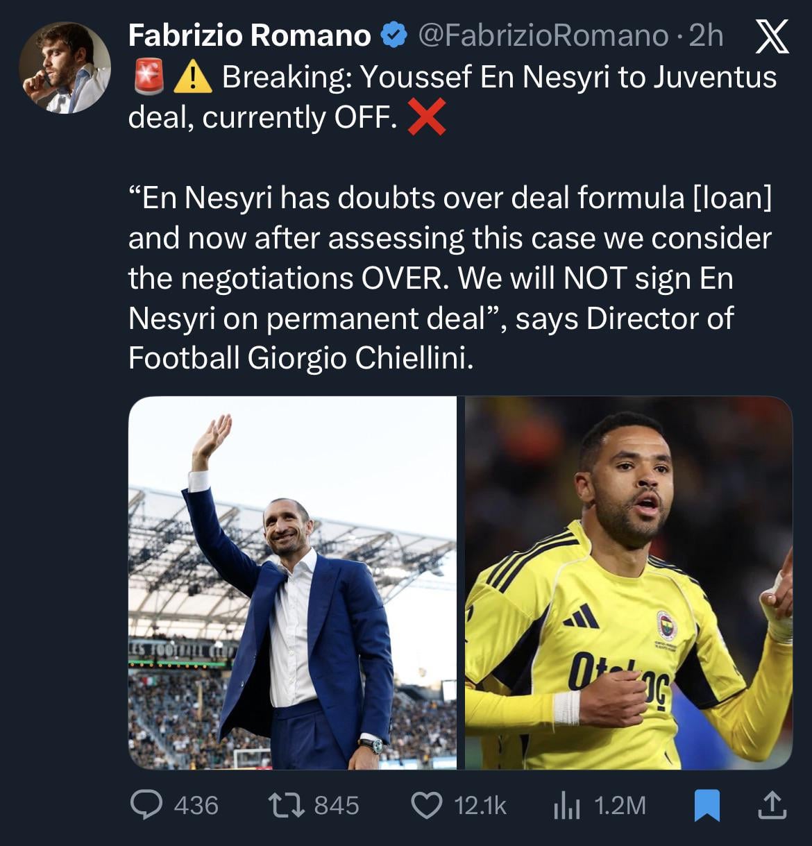I totally agree with this quote. Any player who hesitates to play for us should no longer be considered. In En-Nesyri’s case, it would be a total dream to swap Fenerbahçe, with all due respect, to play for Juventus and return to one of the most competitive leagues in the world. It's his loss.