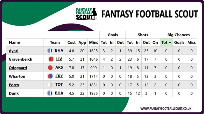 At the end of Gameweek 19, Ayari ranked joint-third in FPL for long range shots behind only Matheus Cunha (£8.0 million) and Dominik Szoboszlai (£6.6 million). Interestingly since then, his two goals have come from inside the box.
