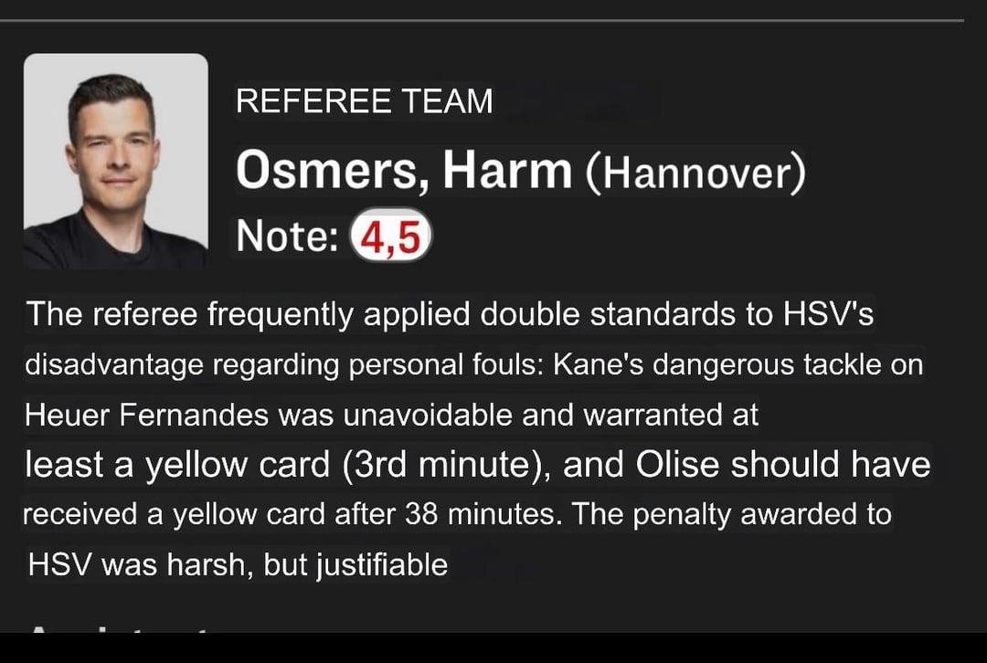 Not entirely off, tbh. None of the decisions against Bayern were grave mistakes but rather situations that were up to interpretation and that could have been called differently. Meanwhile, Kane absolutely deserved the yellow card against HF (and – frankly – another one for all his complaining throughout the game, too), Olise didn’t get a clear yellow, and Remberg got a yellow for playing the ball. So there’s a case to look at it the way the kicker does by calling it a weak performance with the clear mistakes being in favour of Bayern. Generally, it would be better to discuss how to find an answer to the tactics Hamburg applied (pulling players out of their position by mirroring the man-to-man-style) before it’s too late in the CL knockout phase instead of looking for excuses by blaming the referee.