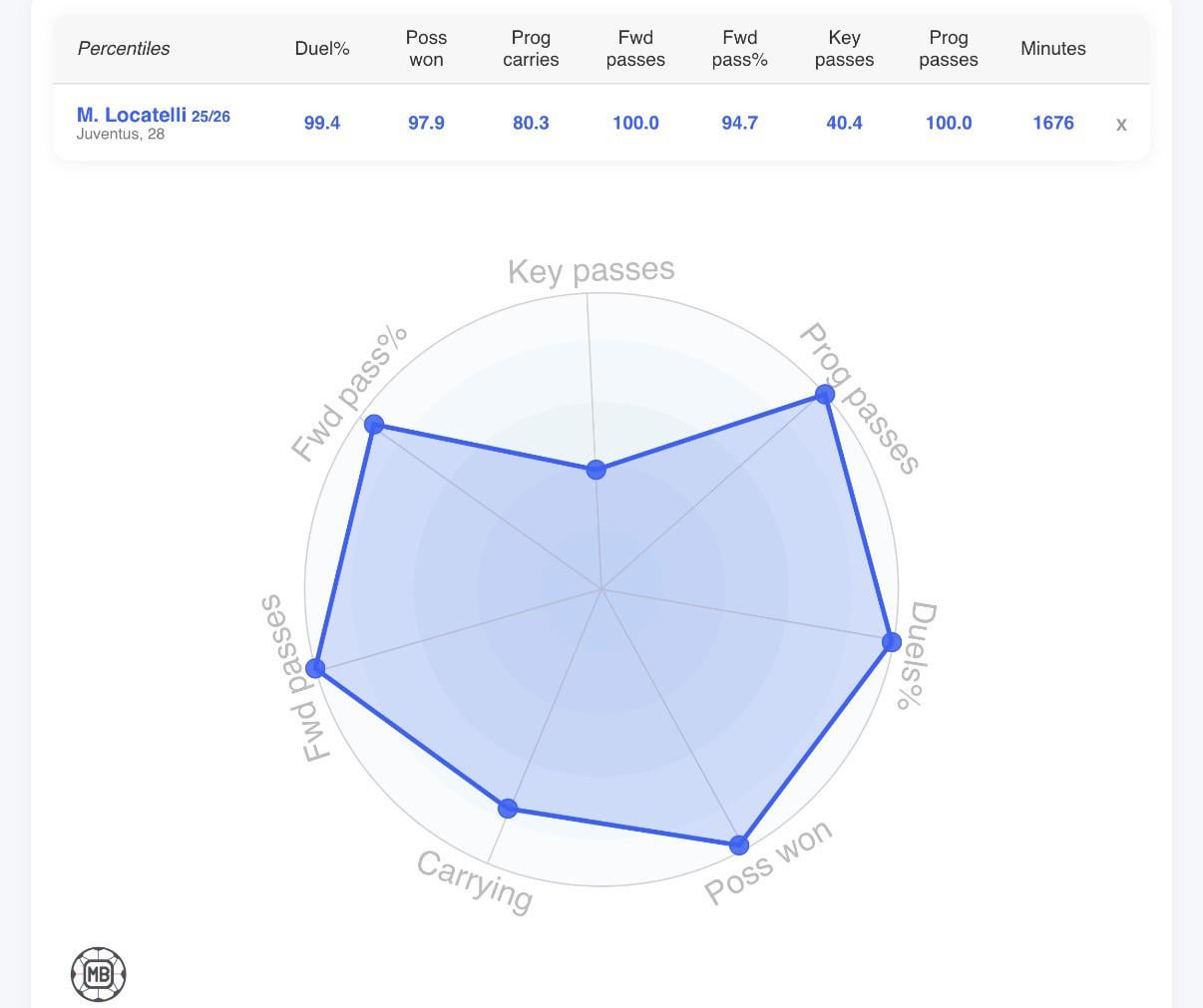 I am not saying Locatelli should win the Ballon D’or, but if Juventus were competing for a Scudetto/CL title it would be hard to mention him in those conversation with these numbers/percentiles. Regardless, this chart and the numbers make it impossible to not mention him with some of the best mid fielders in the world, Bravo Locatelli 👏🏼
