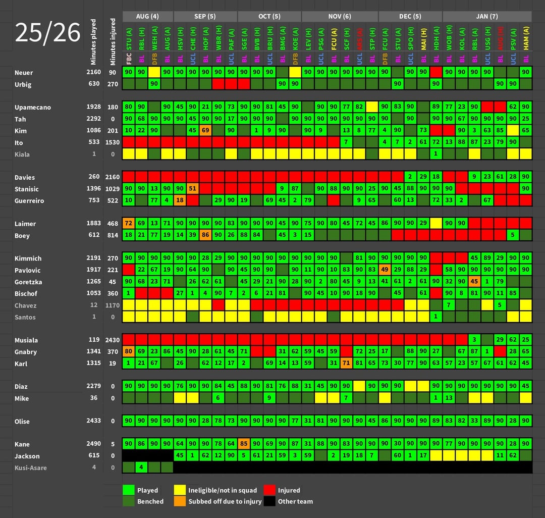 Bayern player availability tracker 25/26, updated for february. I've made 2 versions, one with only first team players who've played this season (slide 1) and one with every player that has gotten minutes this season (slide 2).
