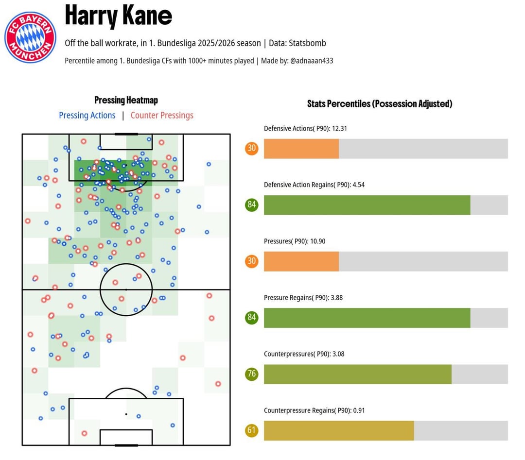 5. The color bars are a bit deceptive given that the percentage comparison is only against those in the same league. So Haaland’s Defensive Actions Regains is actually higher per 90 than Kane’s, etc. The stats here, then, and particularly the comparisons, seem as much (or more) a function of the league and club than the player.