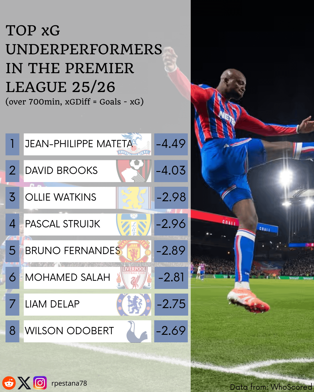 Here are the Top 8 xG overperformers and underperformers in the Premier League this season.