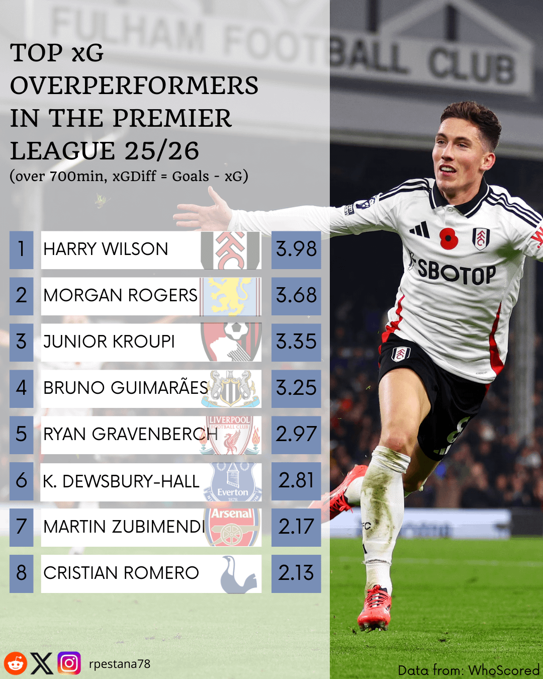 • –3.00 means a player has scored three fewer goals than expected.