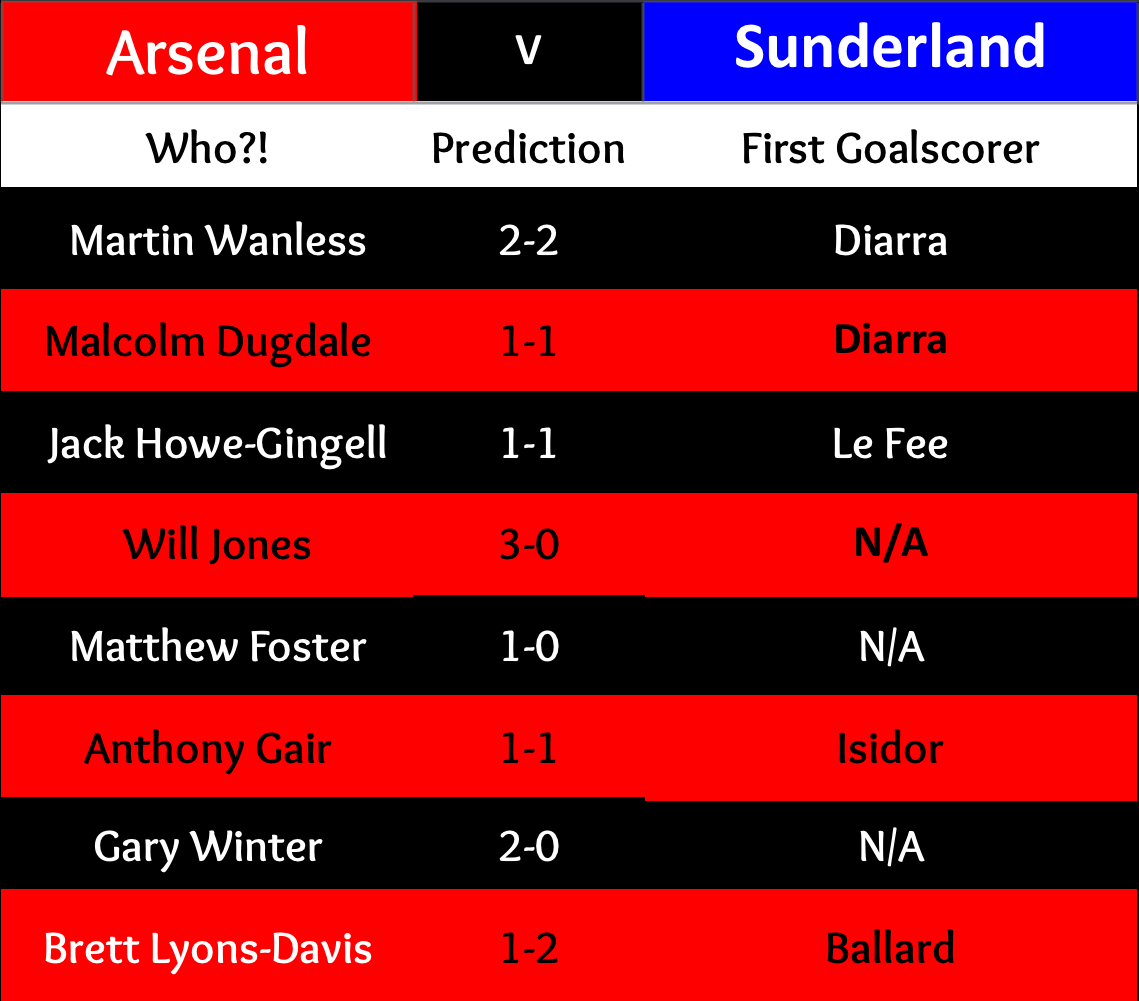 Correct score = Three pointsCorrect outcome (but not correct score) = One pointCorrect first Sunderland goalscorer = One point (no goalscorer is a valid call)Possible deductions for being lazy and not submitting on time = a two-point deduction.