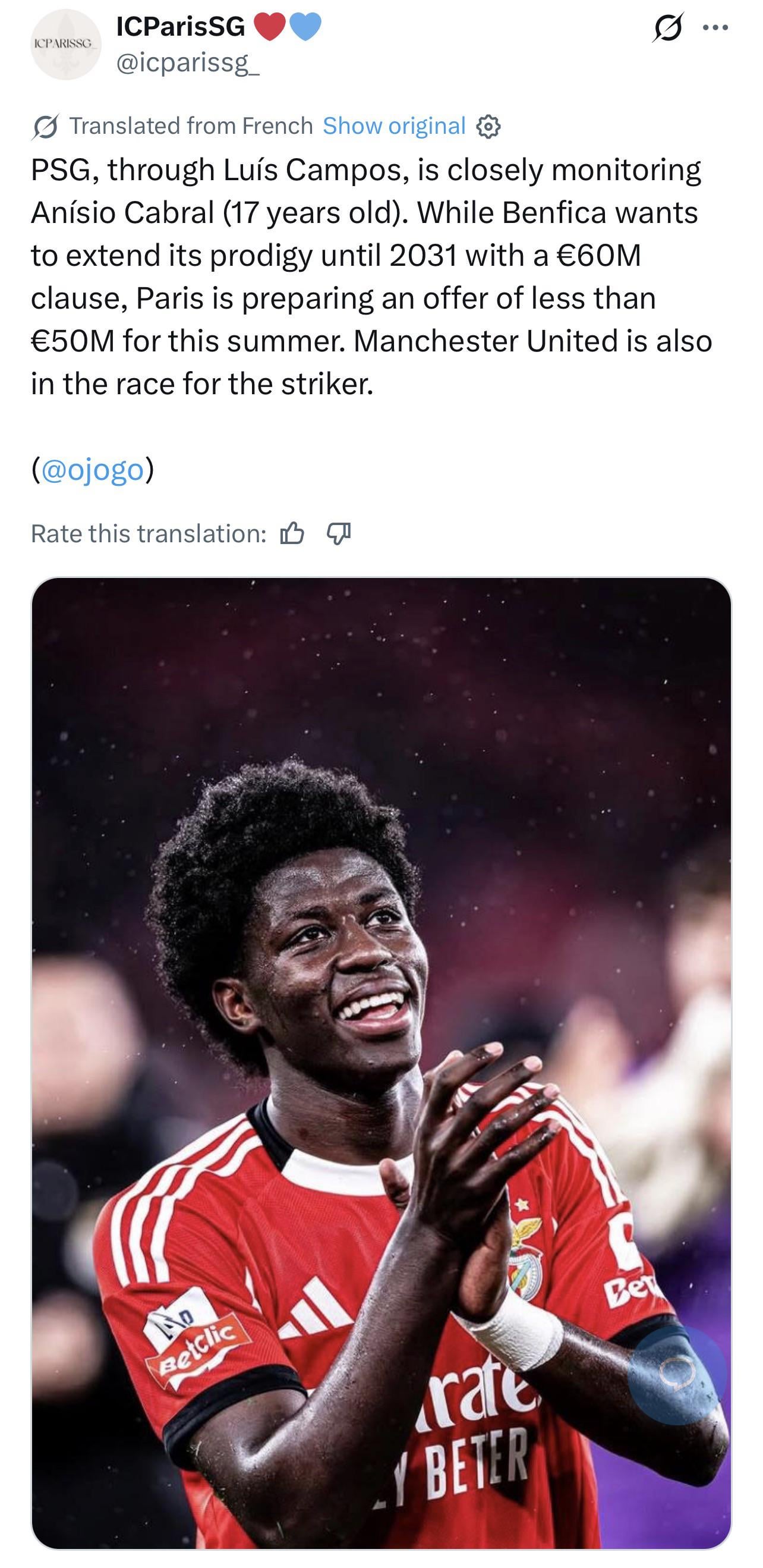 PSG, through Luís Campos, is closely monitoring Anísio Cabral (17 years old). While Benfica wants to extend its prodigy until 2031 with a €60M clause, Paris is preparing an offer of less than €50M for this summer. Manchester United is also in the race for the striker.