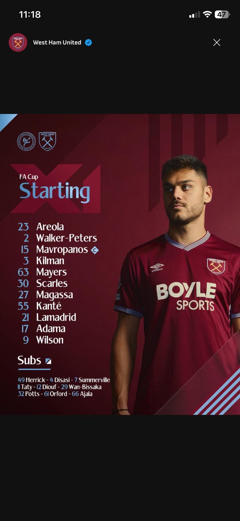 10 changes… That’s a lot of changes.. interesting to see how Kante and Lamadrid do, no Bowen,Soucek or Fernandes on the bench does worry me a tad but there’s still Summerville and Taty.