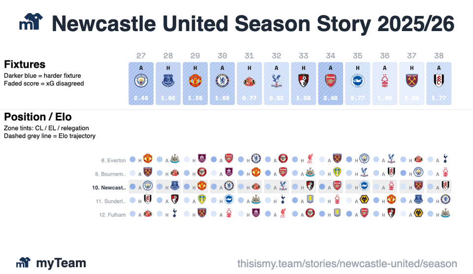There's a fully interactive version of this here on the myTeam website. You can see the run-in too, with fixture difficulty and what teams around have on their plate too.