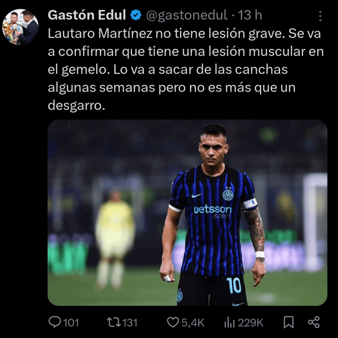 Gaston Edul, tier 1 for Argentina NT “Lautaro Martinez does not have a serious injury. It will be confirmed that he has a muscle injury in his calf. It will keep him off the field for a few weeks, but it is nothing more than a muscle tear.”