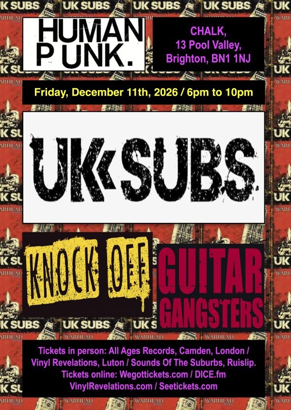 The UK Subs now have announced that they will be playing live at the Chalk venue in Brighton on Friday 11th December 2026, which will mark the 50th anniversary year of the band! Support on the night will come from Knock Off and Guitar Gangsters. The high-energy live music event has been organised by Human Punk., who are specialists in the punk scene. Tickets are on sale now and can be purchased from HERE and HERE.