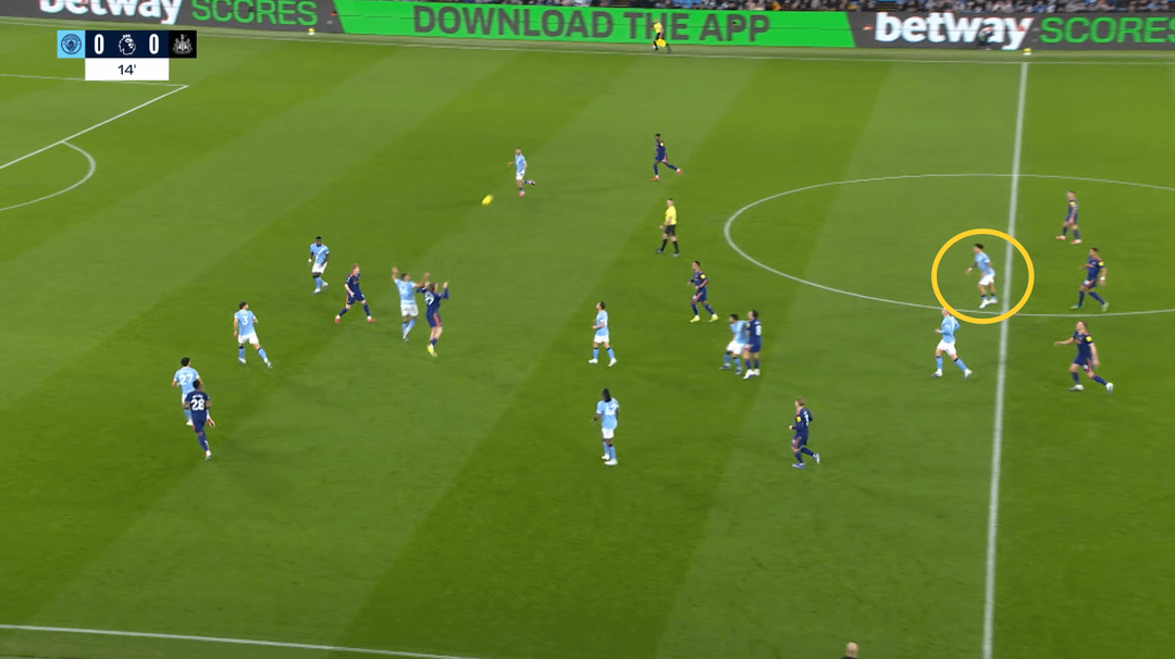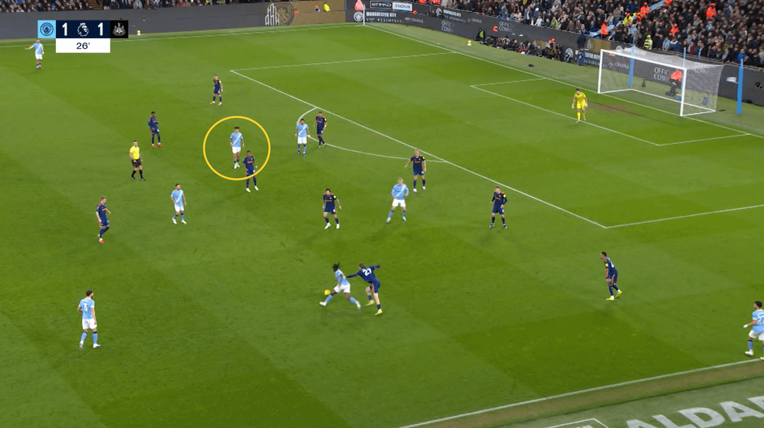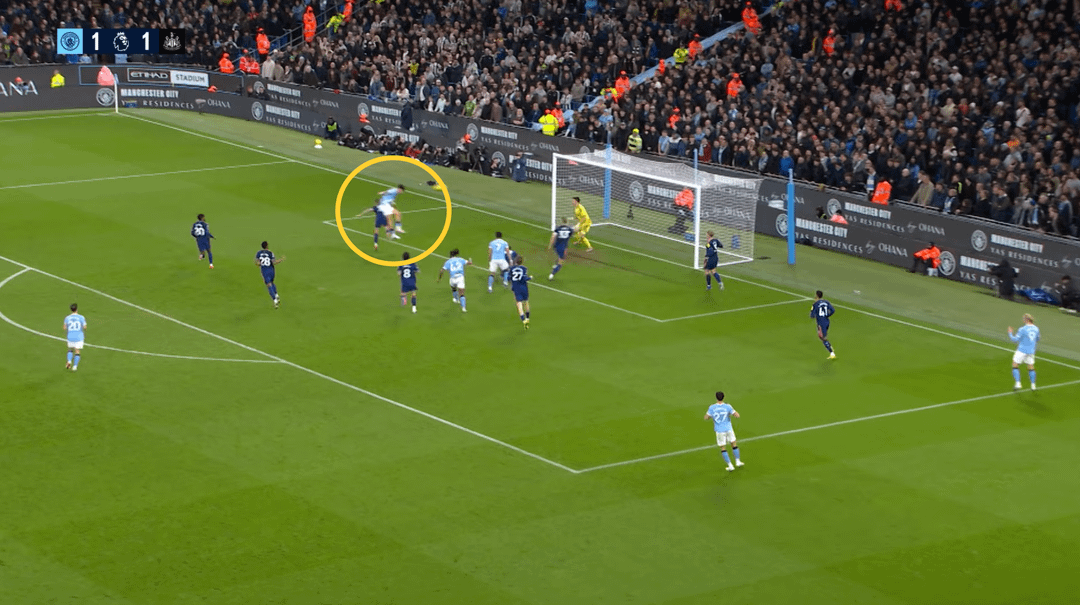 An interesting tactical detail: when Pope took goal kicks, O’Reilly swapped positions with Marmoush. The first aerial duel was contested by the centre-backs and Rodri, while Haaland and O’Reilly attacked the second ball. That’s how City scored the first goal: Rodri won the ball after Newcastle’s clearance, Haaland flicked it on to O’Reilly, who passed to Marmoush, and he drove forward. In the still frames I marked O’Reilly’s position at the moment of the clearance and in the ensuing attack.