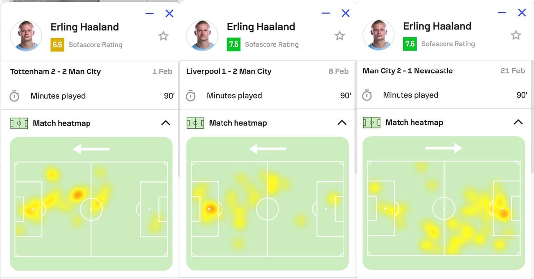 For comparison, look at Haaland’s heat maps in matches against Tottenham, Liverpool and Newcastle — you can see how much time he spent outside the opponent’s penalty area in the latest game.