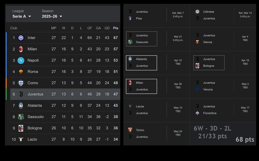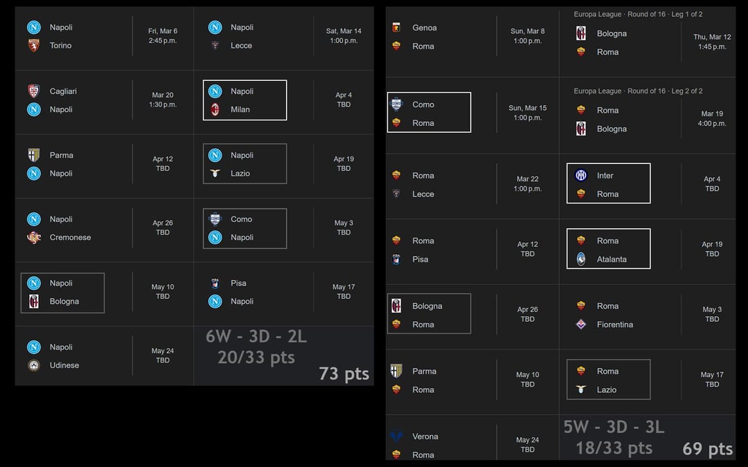 I think Napoli will drop a few more points than you projected, they barely beat Verona. But I agree we need to get results in the big games to make top 4