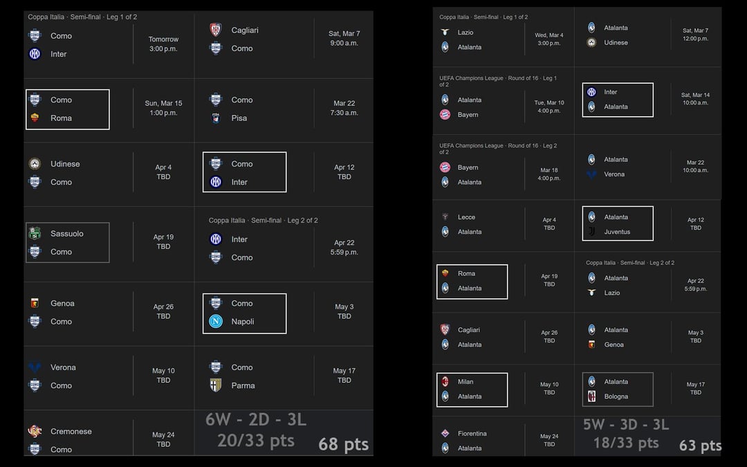 We do have the tie breaker advantage vs Napoli and Roma. We do not vs Como nor Atalanta. If Como can beat Roma next weekend and we win Udinese, we would be 1 pt off Roma and Como.