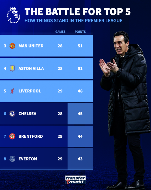 Given English team’s dominance in European football so far this season, the Premier League is all but guaranteed to have five automatic places for next season’s Champions League. Barring a collapse, Arsenal and Manchester City are set to finish first or second, one way or the other. But an enthralling battle is building for the next three places. The likes of Brentford, Everton or Fulham could still make a late push, but it’s likely that three of: Manchester United, Aston Villa, Liverpool or Chelsea will seal those three spots.