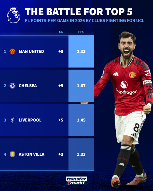 There was a time where Villa looked nailed on for the Champions League places, and were even being talked about as title contenders, but a run of poor form has thrown them right back into the battle, and they face a huge match against Chelsea at Villa Park this Wednesday. Man United have been a revelation since Michael Carrick took the wheel, whilst Liverpool and Chelsea have seem to keep stalling after gathering runs of form. As the fight for the top five heats up, here at Transfermarkt, we’ve analysed the 2026 form of the four main contenders to try and determine who might miss out.