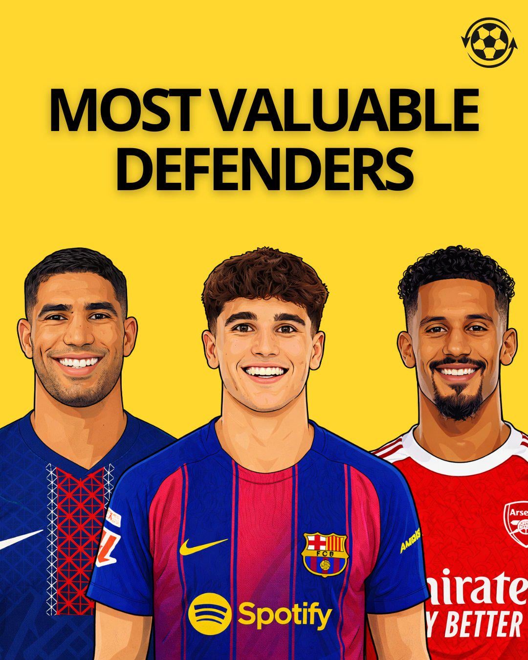The top 5 Most Valuable Defenders in the World: 1. William Saliba — £78M, 2. Pau Cubarsí — £70M, 3. Achraf Hakimi — £70M, 4. Alessandro Bastoni — £70M, 5. Nuno Mendes — £65M as per Transfermarkt.co.uk
