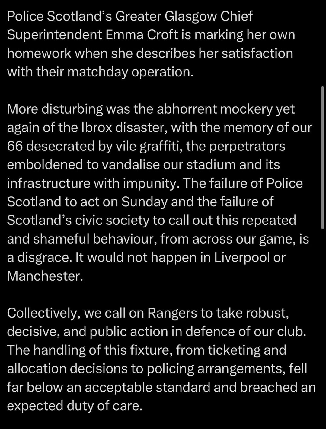 “our fans place din danger before and after the match by a chronic lack of segregation” again, are they talking about the right set of fans here? Because I am sure it is a Celtic fan in hospital after being stamped on.