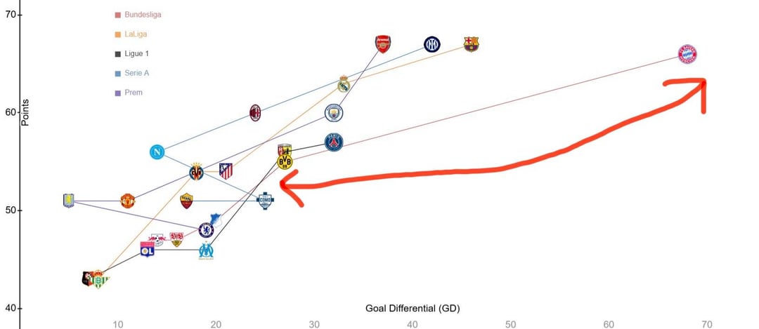 Bayern currently have more goal differential (68) than points (66). I couldn’t find any top 5 leagues team that has ever ended the season with that stat. 2014-15 MSN Barcelona appear to be the closest, with 89 GD to 94 pts.