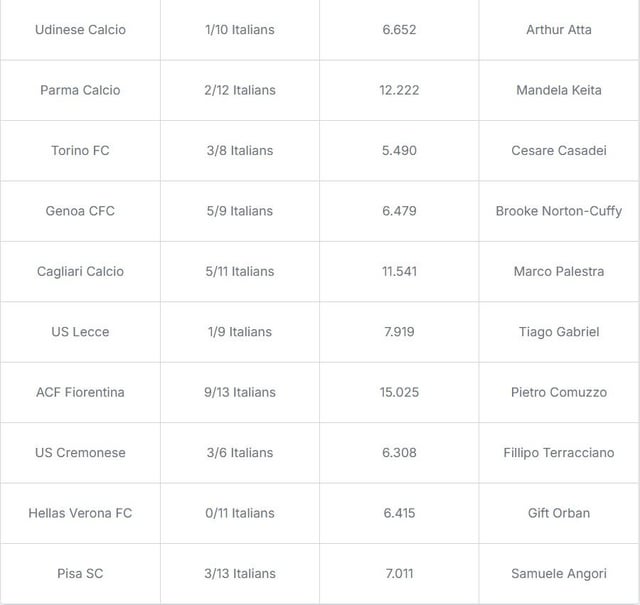 Since my last post about italians per team did well, I decided to do another interesting spreadsheet as of 14.03.2026, this time using all clubs instead of only the Top 10.
