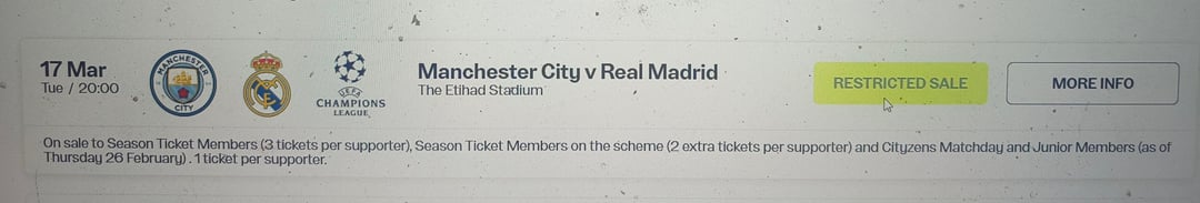 If you’re a neutral fan who hasn’t seen a game in the stadium before, you shouldn’t be going to Man City vs Real Madrid of all games. There are restrictions on these tickets for a reason, there should be no neutral or away fans in the home end.