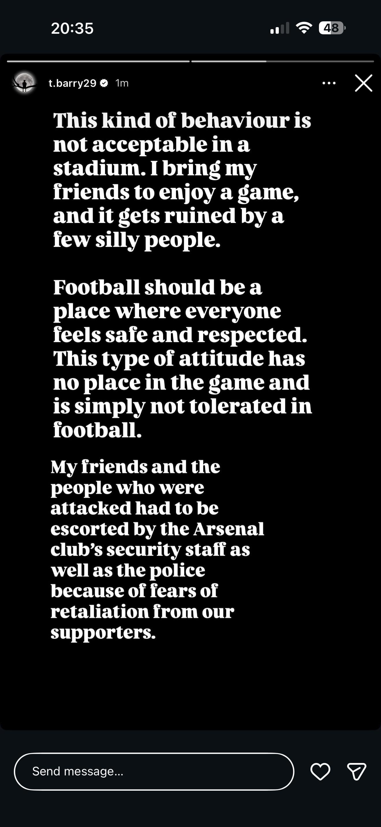 Apparently away “fans” who were frustrated at the results took it out on Barry’s friends in the stands. Horrible