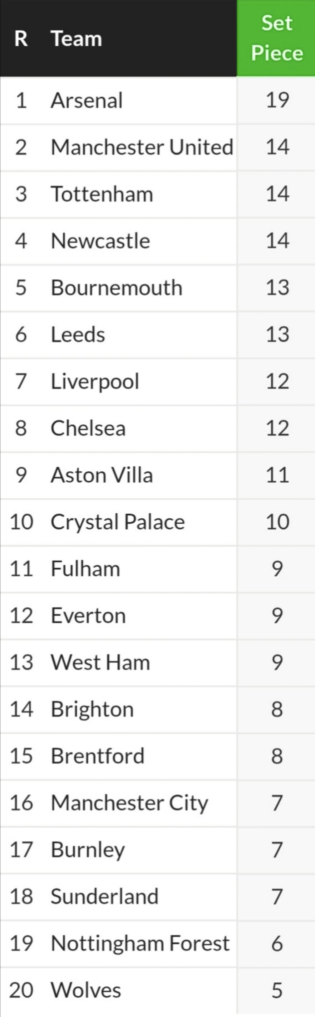 4. Arsenal is a huge outlier. They are insane at set pieces. Even if refs stopped their players from pestering the opposition GK, they would be at the top. They’d still have 14-15 goals.