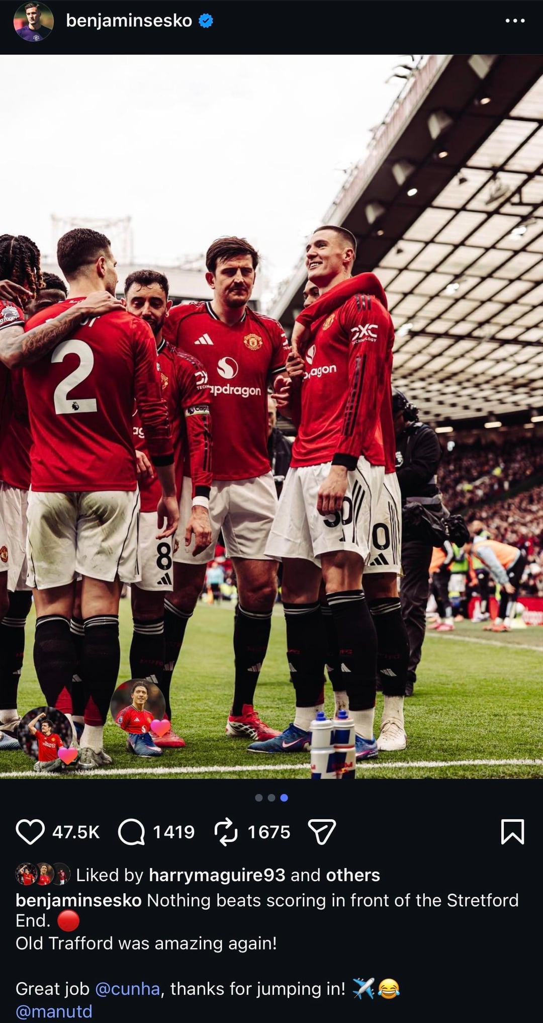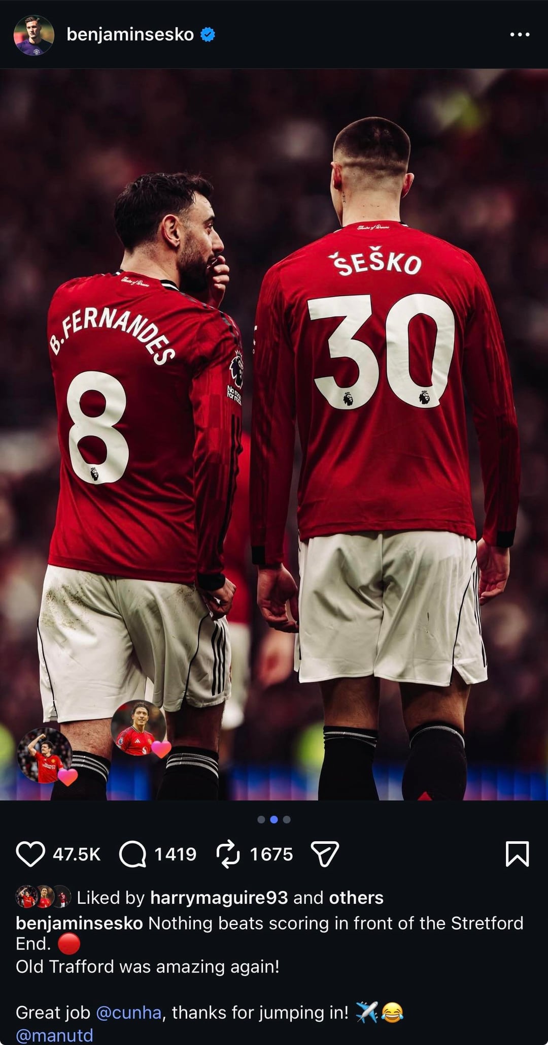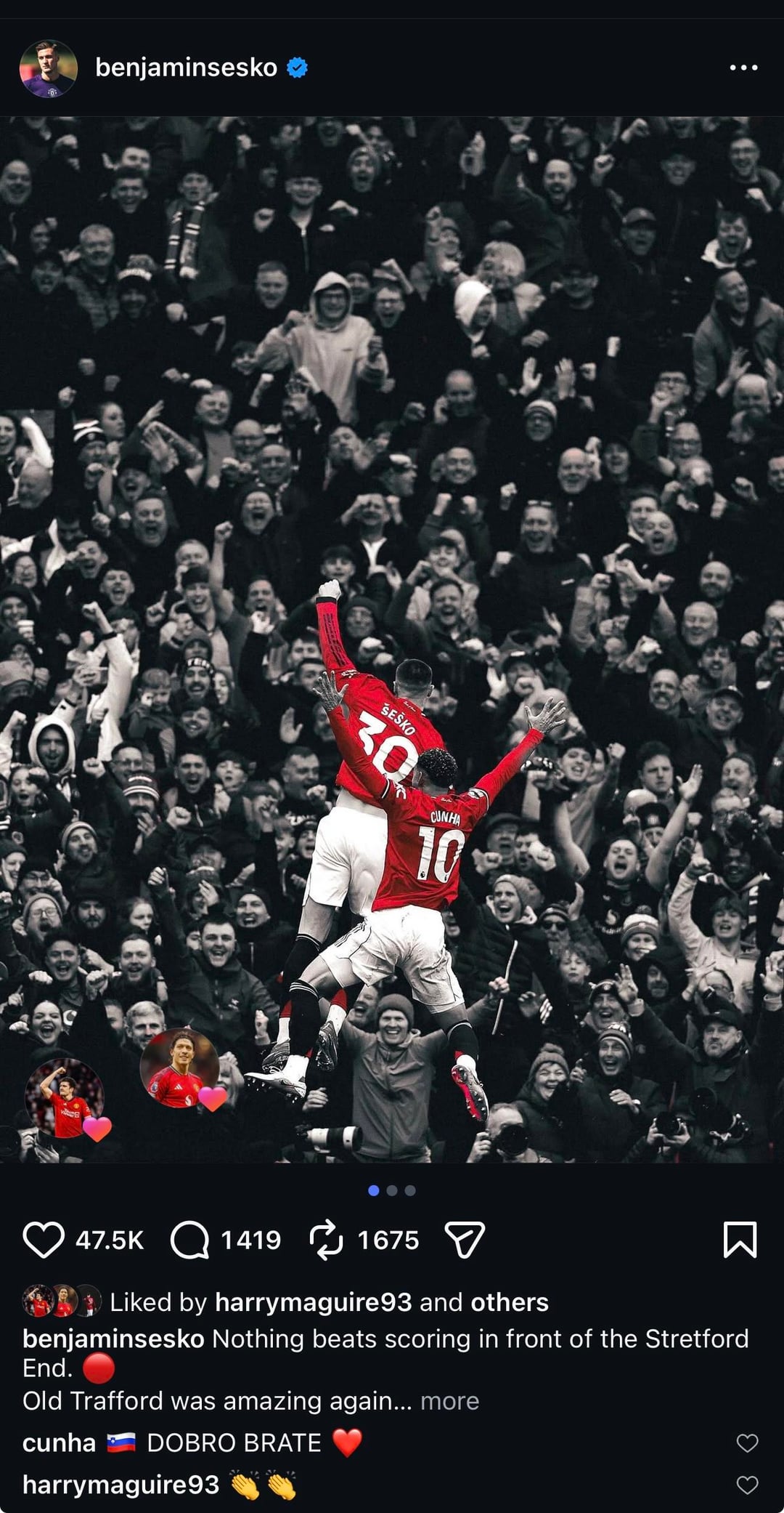 Benjamin Šeško on IG: “Nothing beats scoring in front of the Stretford End. 🔴 “Old Trafford was amazing again! “Great job Cunha, thanks for jumping in! ✈️ 😂”