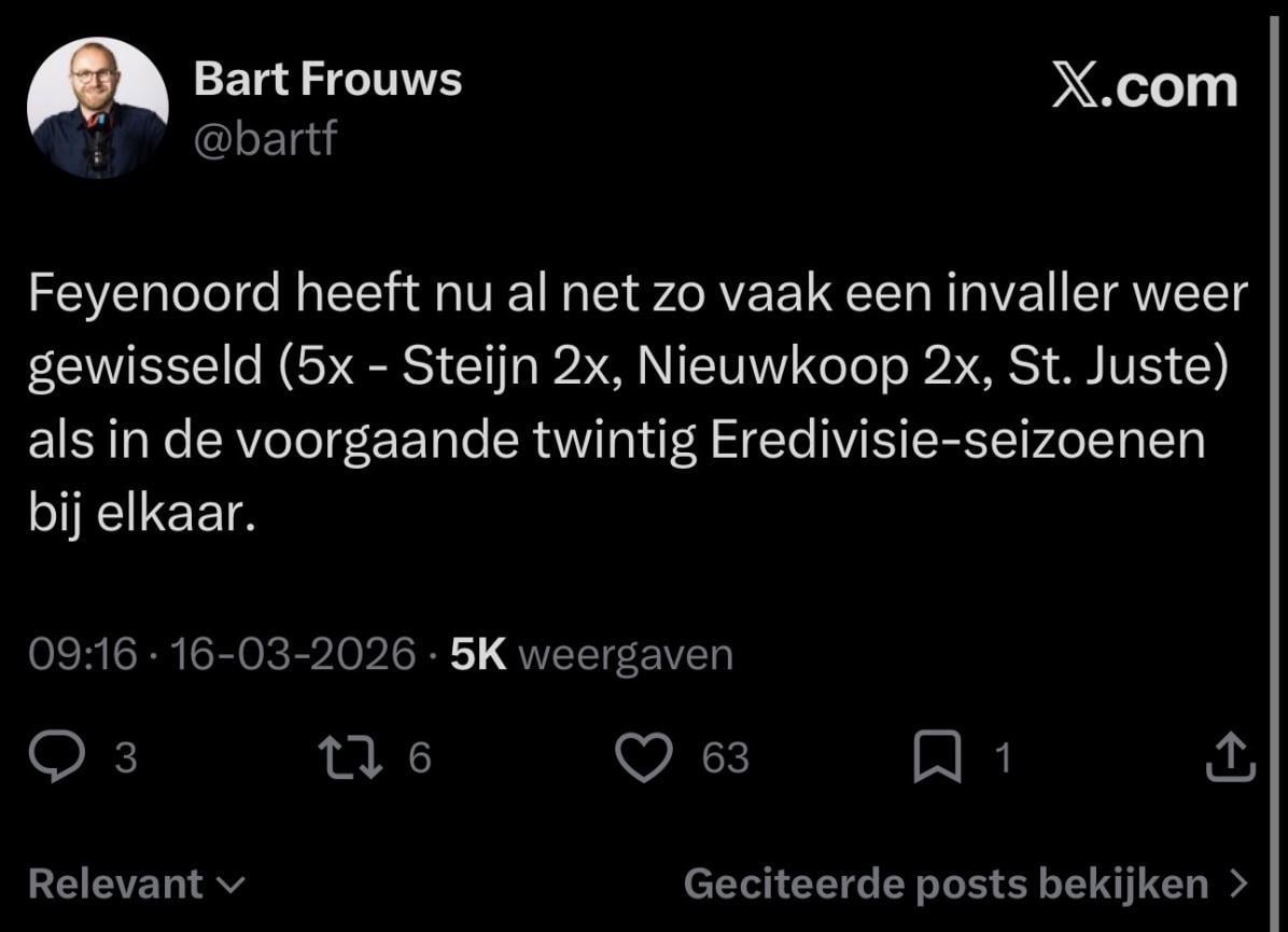 Feyenoord heeft nu al net zo vaak een invaller weer gewisseld (5x – Steijn 2x, Nieuwkoop 2x, St. Juste) als in de voorgaande twintig Eredivisie-seizoenen bij elkaar