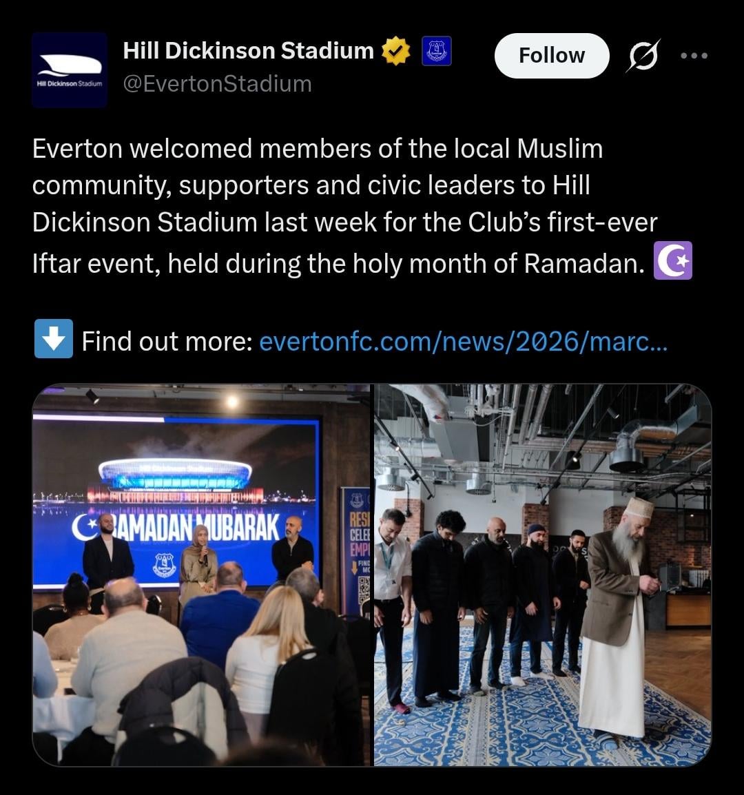 Evertonians are just like most of our society, mate. Many are perfectly decent many are just arses. Problem is with social media that you’ll mostly hear from the arses as all the decent fans will read that and just think “ah, good oh. Everton hosted an Iftar event”. Because ultimately it’s banal, right? Football club hosts event for local community and fans.