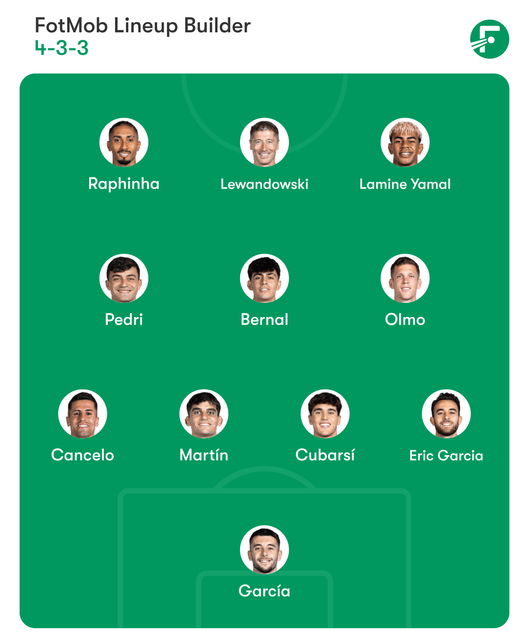 I’ll take Espart on the right. The rest looks great. If Lewandowski continues to play like he did against Sevilla, I’m more than fine with him starting. Dropping deeper and opening spaces for Rapha, Olmo, and even Bernal.