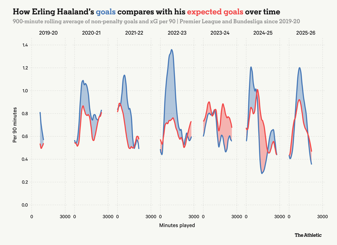 Before Christmas, Haaland had 19 goals in 17 games (29% conversion). Since then, only 3 goals — the same as Virgil van Dijk — with a conversion rate of 8%.