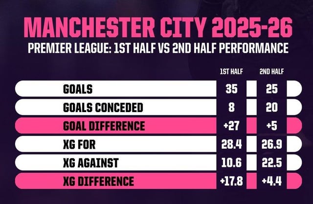 If only first halves counted, City would top the Premier League by 13 points. Second halves only? They’d be eighth. The team falls from top-tier to mid-table after halftime.