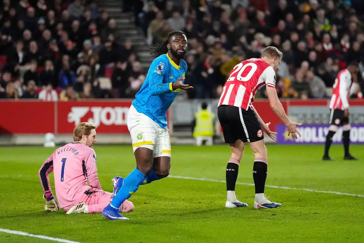 Wolverhampton Wanderers' Tolu Arokodare celebrates scoring during the English Premier League soccer match between Brentford and Wolverhampton Wanderers in London, Monday March 16, 2026. (John Walton/PA via AP)