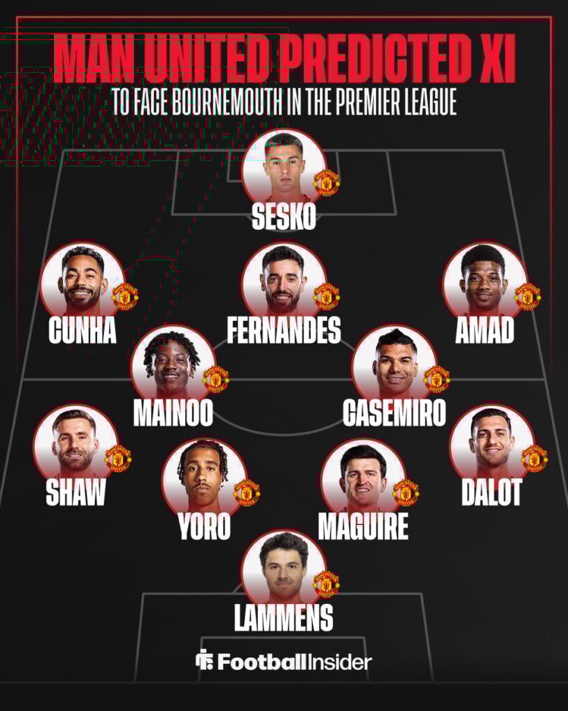 Amad was a threat on the right flank last time out and so could stay in the starting eleven against Bournemouth, with Bruno Fernandes and Cunha also due to keep their respective places in the front four.