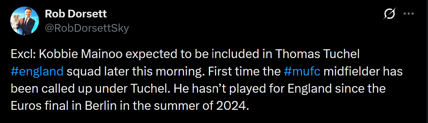 [Rob Dorsett] Excl: Kobbie Mainoo expected to be included in Thomas Tuchel #england squad later this morning. First time the #mufc midfielder has been called up under Tuchel. He hasn’t played for England since the Euros final in Berlin in the summer of 2024.