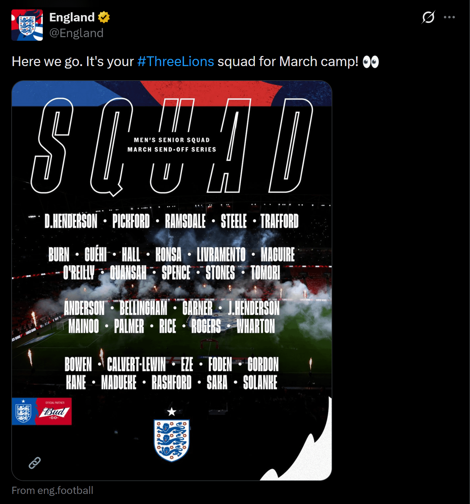 **Forwards:** Jarrod Bowen (West Ham United), Dominic Calvert-Lewin (Leeds United), Eberechi Eze (Arsenal), Phil Foden (Manchester City), Anthony Gordon (Newcastle United), Harry Kane (Bayern Munich), Noni Madueke (Arsenal), Cole Palmer (Chelsea), Marcus Rashford (Barcelona, loan)